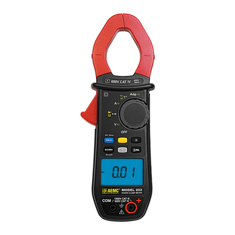 The True RMS Clamp-On Meter Model 203 is safety rated at 600V CAT IV. It measures AC+DC volts and amps, frequency, continuity, resistance, and temperature (with the supplied K thermocouple probe). The Model 203 can also perform diode checks. Its Adapter mode displays external sensor inputs. The Delta relative function compares new measurements to a reference value, and the MIN/MAX function tracks high and low values. This compact and rugged meter can operate in demanding work environments.