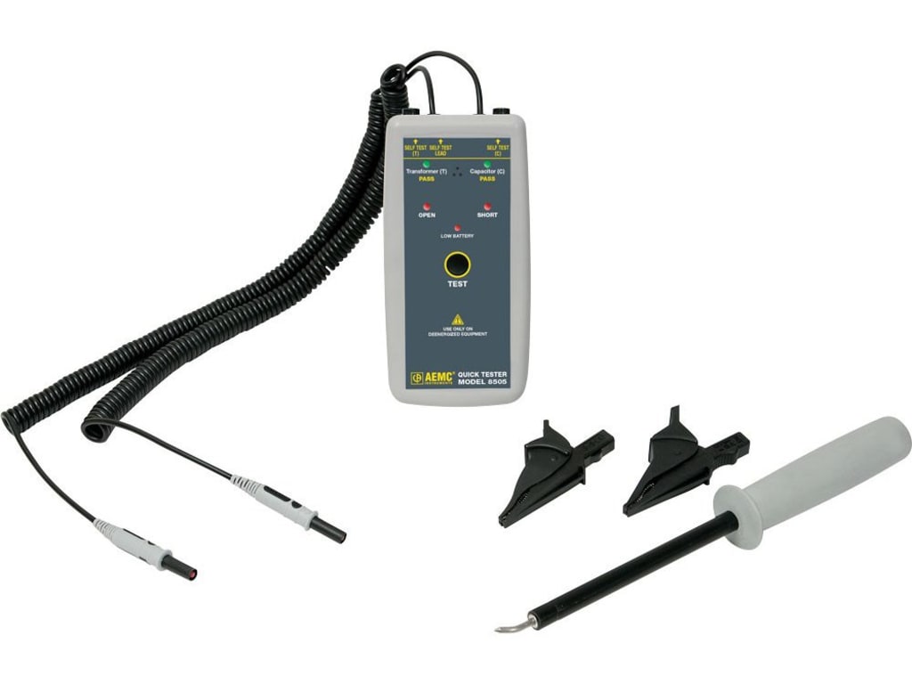 Industrial-scale power transformers and capacitors may be damaged during shipping or may be faulty due to workmanship issues. The Quick Tester Model 8505 enables an inspector to quickly determine whether or not a shipment of transformers and/or capacitors have open or short conditions that render them unusable. It also can verify switch functionality.