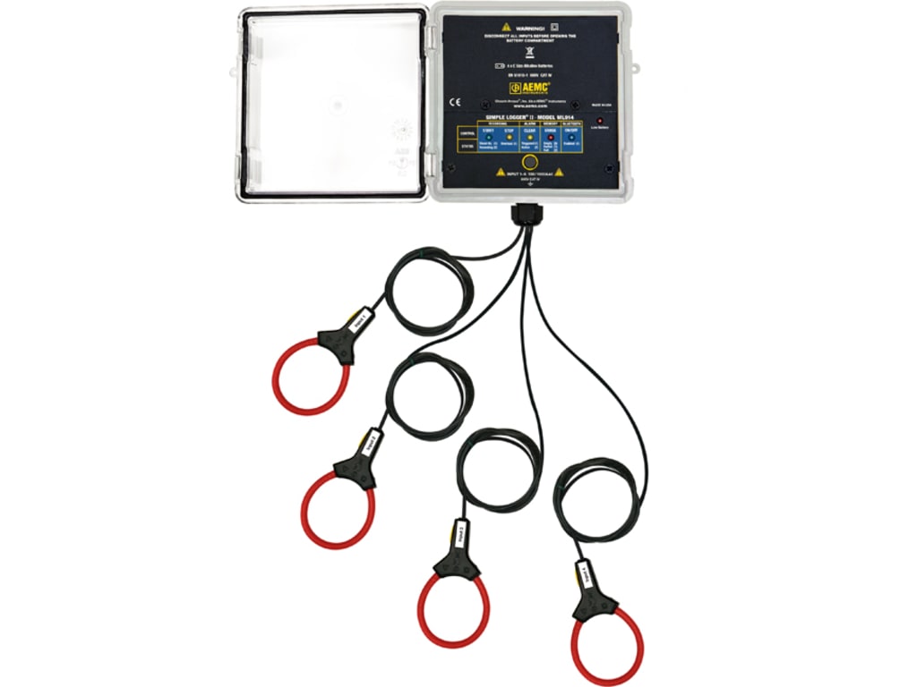 The Simple Logger II (Bluetooth Edition) Model ML914 is a 4-channel AC current recording device powered by alkaline batteries and includes four integral 6" MiniFlex flexible current probes. The ML914 incorporates two user-selectable measurement ranges of 100 and 1000 Amps. Line tracking is performed such that 64 samples over one line cycle are taken. Frequency tracking is performed around the nominal line frequency (50 or 60Hz). Harmonic measurements are calculated from these 64 samples and are only available from the Simple Logger II Control Panel within the DataView software.