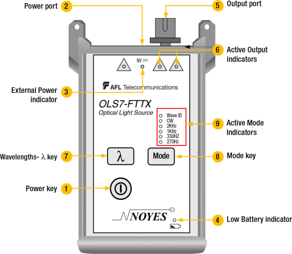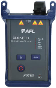 The AFL OLS7-FTTX triple wavelength laser sources are hand-held, rugged laser sources designed for performing insertion loss measurements on single-mode fiber optic links when used with an optical power meter. When paired with an optical fiber identifier (OFI-200D), both models may be used for fiber identification. The LASER output is stabilized to ensure accurate test results per current TIA/EIA and ISO standards requirements. Faster Test Times with WaveID and Multiple Wavelengths - In WaveID mode, the AFL OLS7 encodes each wavelength with a unique WaveID code. When used with an AFL OPM, the pair can send and receive two or three wavelengths each test - doubling or tripling testing efficiency - vastly reducing test time! Flexible Output Connector Adapter Design - Output ports on all OLS7 models feature UCI based removable adapters to allow in field removal of output connectors for inspection and cleaning of launch ferrule end-face. Removeable adapters also facilitate simple field changing of launch fiber connector between FC, SC, ST, and LC connector adapters providing access to common connectors used in today's networks.