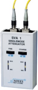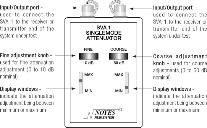 The SVA1 Single-mode Variable Attenuator advances fiber optic field testing by offering superior performance in a low cost hand-held package. Utilizing a simplified, industry accepted attenuation technique; the innovative design of the SVA1 offers superior resolution across the entire 60 dB dynamic range. Intended for field testing during installation, new equipment turn-ups, or routine maintenance, the SVA1 is a complete, easy to use attenuator. Its unique features allow bidirectional signal transmission with no loss penalty. Never be caught with low or discharged batteries. The mechanical design of the SVA1 uses no batteries - it is always ready when you need it. Input/output ports of the SVA1 are equipped with tool-free removable adapters to allow the output connectors to be inspected and cleaned. The SVA1 is available with a variety of connectors and reflectance options to better than 60 dB. With only two adjustments, COARSE and FINE, the SVA 1 is simple to understand and operate. The SVA1 is suited for all single-mode applications including Telco, LANs, WANs, Video, and CATV.