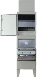 The DCS2500 has been designed for use by Plastic Extrusion and Injection Molding companies to remove fine particulate, smoke and fumes from the exhaust stream of plant operations including tool cleaning in Fluidized Temperature Baths. The DCS2500 does not require any power, natural gas or continuous water supply to operate. In all Extrusion and Injection molding cleaning operations there is a quantity of smoke and fumes that may need to be removed depending on the customers needs and expectations as well as local regulations. With a Fluidized Temperature Bath the waste is in the form of smoke, particulate and fumes which occurs due to Pyrolysis of the plastic. This waste can be easily removed from the exhaust stream by the stationary model DCS2500 HEPA Air Filtration system as shown in the product brochures below. In manufacturing plants where an exhaust system is already in place to capture smoke and fumes from Extruders, other operations and the tool room, a filtration system may not be required. If one is necessary our system will remove smoke, particulate and fumes while reducing odor from the exhaust stream allowing the filtered air to be vented directly outside or into the plant exhaust stack.