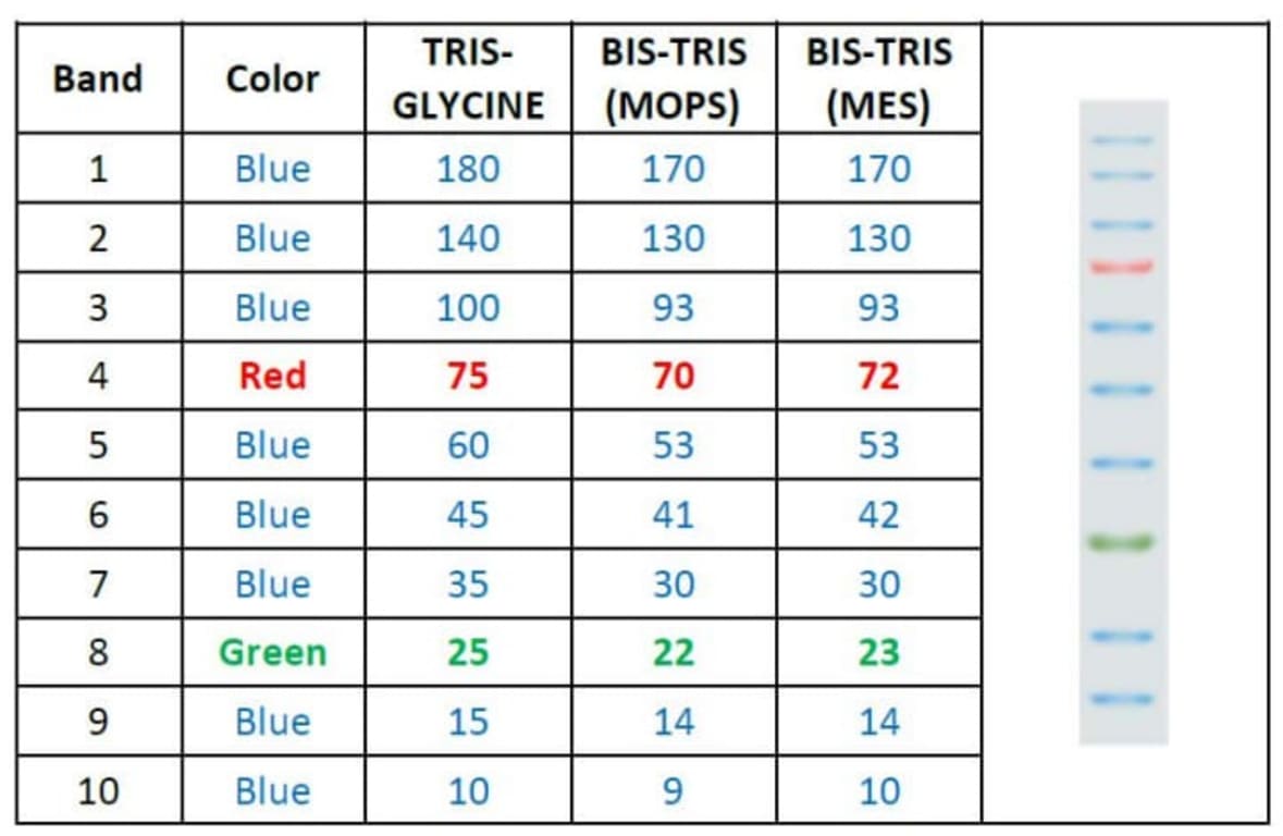 The SmartCheck™ Tri-Color Regular Range Protein Markers are ready-to-use standards with 10, 12, or 13 pre-stained proteins covering a wide range of molecular weights from 5 to 245 kDa.* Proteins are covalently coupled with a blue chromophore with two alternate-colored reference bands (one green and one red band at 25 kDa and 75 kDa respectively). Tri-Color markers are ideal for western blotting applications, as the enhanced green and red bands make it easy to identify the orientation of the blot after transfer.