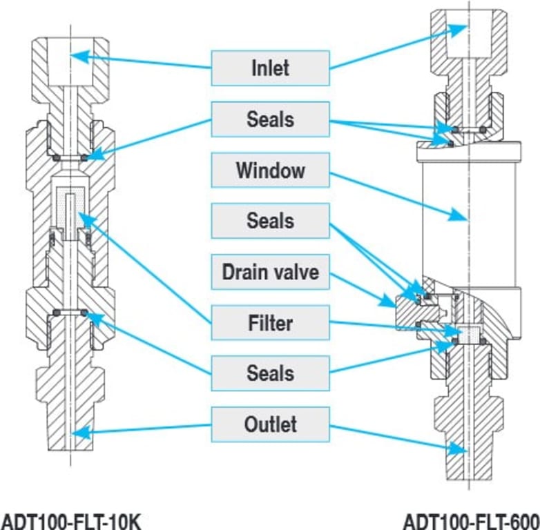 The Additel 100-FLT-600 is a pneumatic filter and liquid trap covering from -15 to 600 psi (-1.0 to 40 bar). This filter is ideal for your pneumatic measurement or calibration applications and contains an easy to use drain valve for removing dirt, moisture or contaminates. For hydraulic applications, the Additel 100-FLT-10K, hydraulic filter can be used up to 10K psi (700 bar). With a filter resolution of 0.07 mm contaminants or debris are captured in the filter which is easy to clean and maintain. Each filter is configured with a variety of pressure connections designed to meet the most common applications.