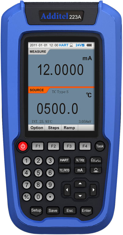 The 223A multifunction calibrator is a process tool for measuring, sourcing and simulating mA, mV, V, RTDs, thermocouples, ohms, frequency, pulses and pressure, and captures switch values and provides 24 V loop power.