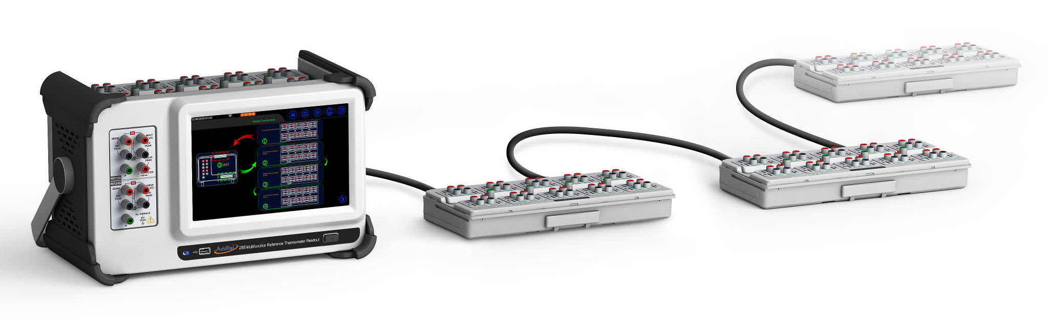 The Additel 286 Multifunction Reference Thermometer Readout is an industry first! We have combined the capabilities of a high-end reference thermometer with a highly capable data acquisition system and 8.5 digit multimeter. The ADT286 is capable of scanning and recording up to 82 channels at 10 channels per second. Users can easily configure the ADT286 to perform field calibrations and uniformity studies as well as use the unit in the lab as a precision thermometer and 8.5 digit multimeter. Get more for less with this newest game changer from Additel! ADT 286 Multifunction Reference Thermometer Readout Scanner Modules If you're in need of a precision reference thermometer for your laboratory, then look no further than the Additel 286. The base unit comes with two precision readout channels that can be used to measure your SPRT. Need to calibrate RTDs, PRTs, thermistors or thermocouples? Add a scanner module and you now have the ability to measure 10 RTDs, PRTs, or thermistors and 20 thermocouples. Expand up to 82 channels with our unique easy to use scanner modules. Each 20 channel module is outfitted with our proprietary universal terminals with an industries best cold junction capability second to none. Utilize the module docked atop the ADT286, or connect remotely with cables to suit nearly any unique setup/configuration. Additel also has a process module specifically designed to measure process instrumentation like transmitters and switches. This scanner will also supply loop power for the transmitters. Designed to make your job easier, the ADT286 has a large sensor library supporting 15 TC types, both standard and special limits, 18 different thermal resistors, CVD, ITS-90, and a large variety of standard curves for RTDs and thermistors. The ADT286 is loaded with special applications such as probe calibration, SPRT calibration, chamber mapping and more. And we continue to add applications on a regular basis!