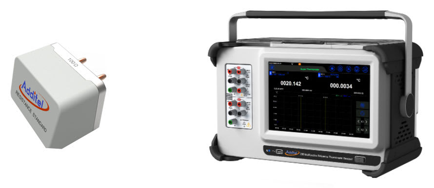 Automatic Temperature Control and Probe Calibration The Additel 286 Multifunction Reference Thermometer Readout has preinstalled drivers to control Additel and other manufacturer’s heat sources. Simply connect to one or more heat sources via a communication cable, Ethernet or wireless and now it will automatically control to the set point and desired stability. If your heat source is not on the list, you can easily add the driver yourself so you can run automated calibrations with any heat source. Now combine the heat source control feature with our probe calibration application and you have a very powerful automatic calibration solution. The probe calibration app allows you to automatically setup and run calibration routines with multiple set points and multiple heat sources, collect data, and develop calibration coefficients — all with one device and without the need of software! Simply place a batch of sensors of any mix and type into your heat source, connect it to the ADT286, run the probe calibration app and come back to a completed test. All that is left to do is generate and export all the calibration data. There’s no need to work with complicated software for communication, set up or coefficient generation. There is no reason to have a calibration technician manually monitor the process and record the data. This Multifunction Reference Thermometer Readout will do all the work for you. ADT286-RS Resistance Standards Available in 25 and 100 Ohm values, users can enjoy improved resistance ratio performance by easily plugging one of our reference resisters into channel 2 on the new ADT286. Perfect for calibrating your SPRT’s and high end PRT’s.