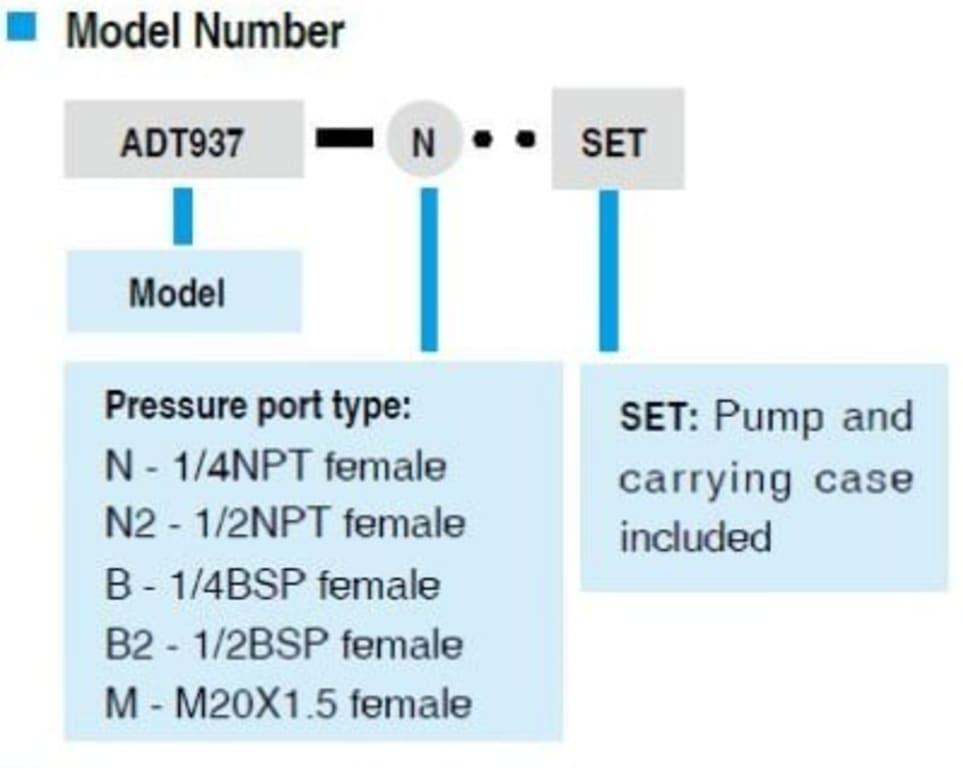 ProductAdditel ADT937-N-SET Hydraulic Pressure Test Pump, -12 to 15000psi (-0.85~1000)bar,1/4NPT ...Additel ADT937-N Hydraulic Pressure Test Pump, -12 to 15000psi (-0.85~1000)bar,1/4NPT F (c ...Additel ADT937-N2 Hydraulic Pressure Test Pump, -12 to15000 psi (-0.85~1000 bar),1/2NPT in ...Additel ADT937-N2-SET Hydraulic Pressure Test Pump, -12 to 15000psi (-0.85~1000)bar, 1/2NP ...