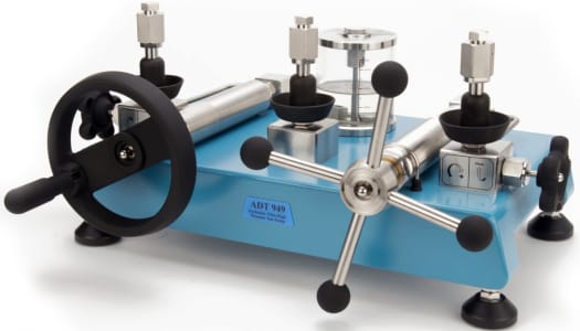 The 949 Hydraulic Ultra-high Pressure Test Pump is a hand operated pressure pump designed to generate pressure up to 40,000 psi (2,800 bar). With the patented screw press technology, high pressures can be easily generated, increased and decreased smoothly. A specially designed shut-off valve makes the pressure as stable as possible during calibration. With no non-returning valve, the 949 avoids the troublesome leakage issues that is usually experienced with hand pumps and allows for minimal maintenance. The 949 is an ideal comparison test pump for calibrating ultra-high pressure measuring instruments such as test gauges, indicators or transducers in the laboratory.