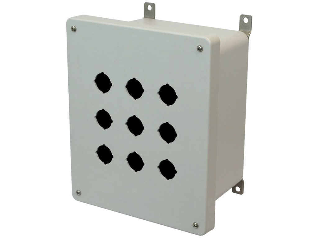 AM Series boxes are designed to insulate and protect controls and components in both indoor and outdoor applications and are especially well suited for high temperature or corrosive environments. They feature flat covers with a variety of latching options that allow you to provide the level of security or ease of access needed for each application. The AM Series offers a wide variety of sizes and configurations, including Small junction boxes, Inline pushbutton enclosures in one, two, or three hole configurations and two hole sizes, Standard JIC size enclosures.