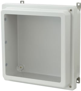 The Allied Moulded AM1224RHW is a 12" x 12" x 4" AM-R Series fiberglass wall mount enclosure assembly with raised 2-screw hinged window cover. Non-corrosive, non-conductive, light weight with lower installation cost, easy to modify and longer life cycle compared to steel. Rigid design with back panel inserts plus stainless steel mounting brackets and a gasket system encased in a continuous channel on the cover.