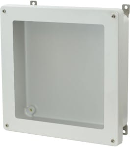 The Allied Moulded AM1224W is a 12" x 12" x 4" AM Series fiberglass wall mount enclosure assembly with 4-screw lift-off window cover. Non-corrosive, non-conductive, light weight with lower installation cost, easy to modify and longer life cycle compared to steel. Rigid design with back panel inserts plus stainless steel mounting brackets and a gasket system encased in a continuous channel on the cover.