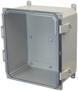 12″x12″x6″ POLYLINE® polycarbonate wall mount enclosure assembly with hinged clear cover and nonmetal snap latch.