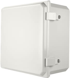 12″x12″x6″ POLYLINE® polycarbonate wall mount enclosure assembly with hinged cover and nonmetal snap latch.