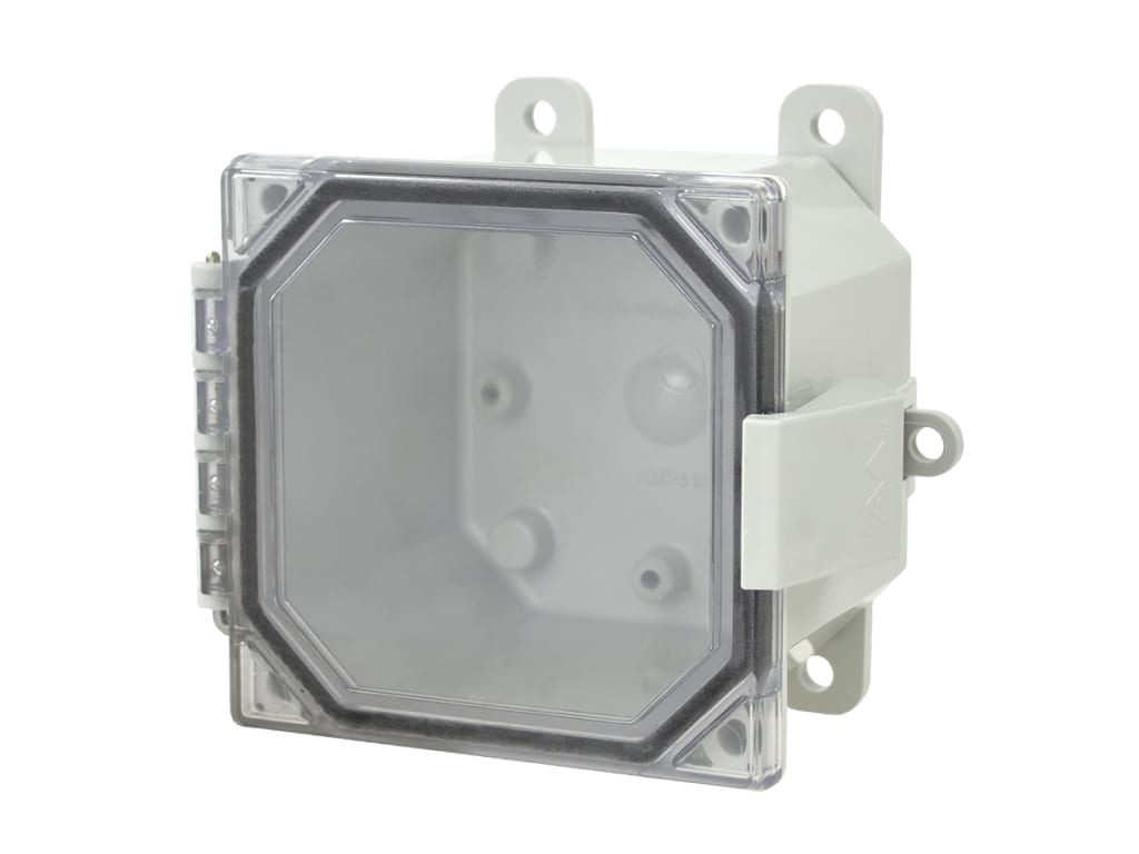 • 4"x4"x3" POLYLINE Polycarbonate Wall Mount Enclosure Assembly with Hinged Clear Cover and Nonmetal Snap Latch