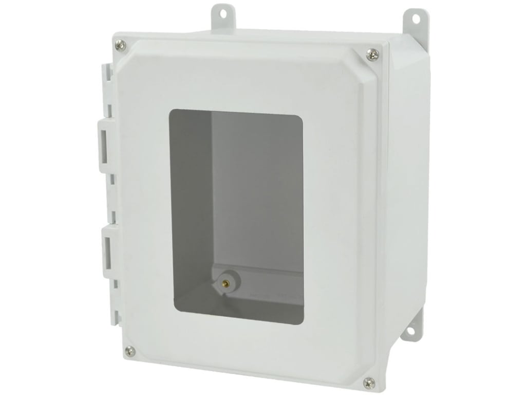 The Allied Moulded AMU1086W is a 10" x 8" x 6" ULTRALINE fiberglass wall mount enclosure assembly with 4-screw lift-off window cover. Non-corrosive, non-conductive, light weight with lower installation cost, easy to modify and longer life cycle compared to steel. Rigid design with back panel inserts plus nonmetallic mounting brackets and a gasket system encased in a continuous channel on the cover.