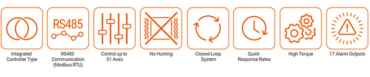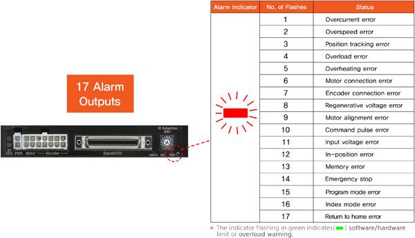 Over current, over speed, position tracking, over load, over heat, motor connection, encoder connection, regenerative voltage, motor misalignment, command speed, input voltage, in-position, memory, emergency stop, program mode, index mode, home search mode |