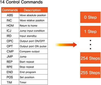 ABS (move absolute position), INC (move incremental position), HOM (home search), ICJ (jump input condition), IRD (waiting input), OPC (on/off of output port), OPT (on pulse from outuput port), JMP (jump), REP (start repetition), RPE (end repetition), END (end program), POS (position set), TIM (timer), CMP (compare output) |
