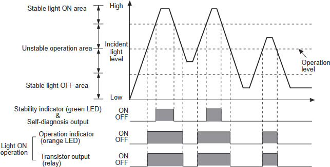 The waveforms of "Operation indicator" and "Transistor output" are for Light ON operation. They are opposite operation for Dark ON operation.