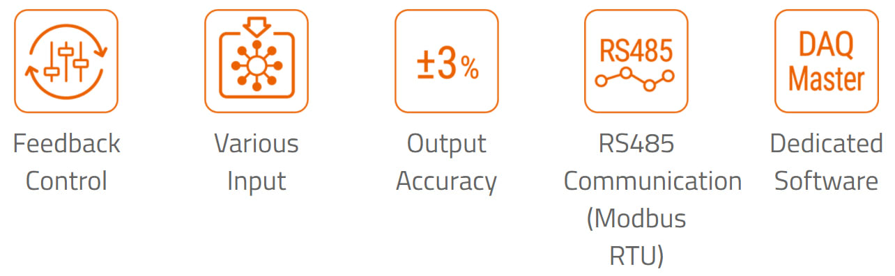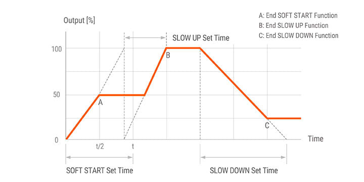 Various user friendly functions are available including soft start, slow up/slow down, input/output slope correction, multi-SP (setting point), full load auto recognition, and more.