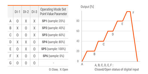 Set up to 6 setting points, and the output can be controlled in relation to 3 digital inputs.
