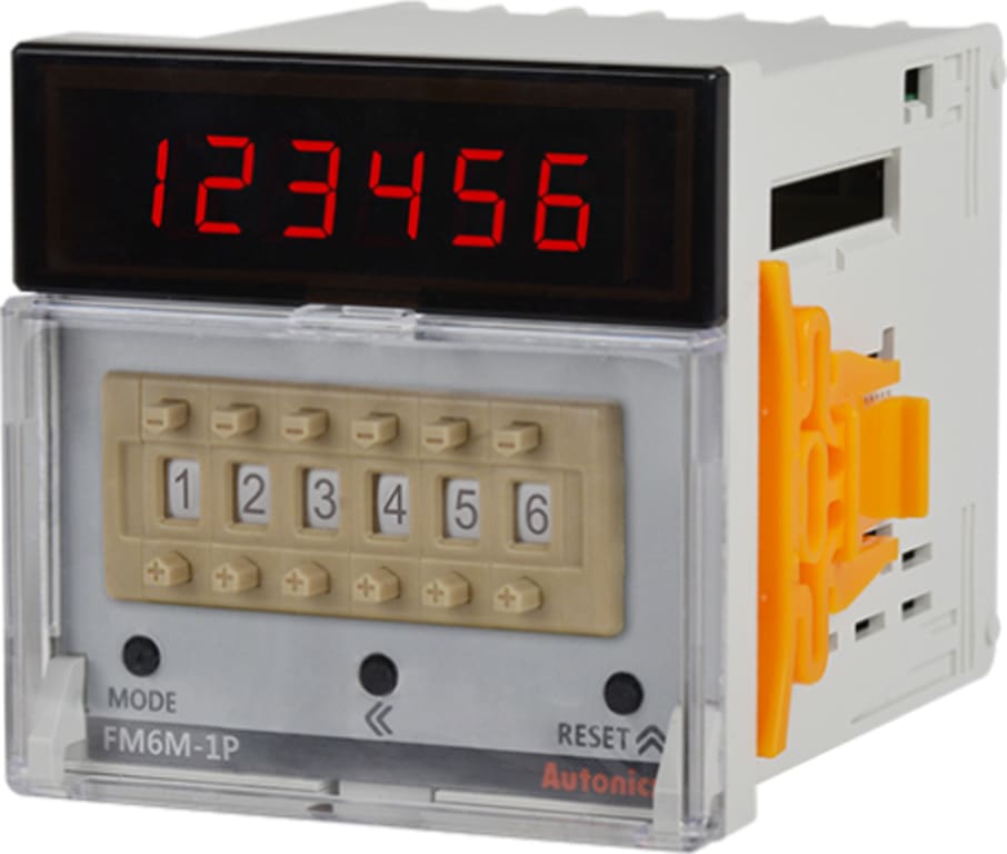 The FM series measure counters can preset multiple or divisor for 1 input pulse and display the calculated value in multiply-mode and divide-modes. The counters feature counting speeds of 1 cps, 30 cps, 300 cps, 2 kcps, and 5 kcps and decimal point display function (fixed decimal point). The FM series counters feature a standard DIN size of W 72 x H 72 mm and are available in 4-digit and 6-digit models.