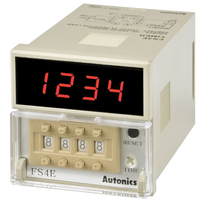 The FSE series digital timers feature a wide time setting range between 0.01 seconds to 9999.9 hours. Simple configuration is possible with the front thumbwheel switches. The 8-pin plug type connection allows easy installation and maintenance. The FSE series timers are available in 4-digit and 5-digit models.