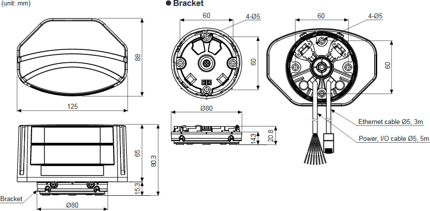 Ø5mm, 4-wire, 3m, shielded cable (AWG 26, core diameter: 0.16mm, number of cores: 7, insulator out diameter: Ø1mm) |