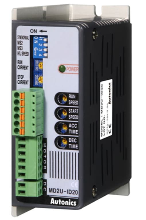 The MD2 series 2-phase stepper motor drivers allow extremely precise motor control with low mechanical noise and low vibration operation. The isolated photocoupler input design minimizes influence from electrical noise. Low vibration operation is possible with the microstepping drive function (MD2U-MD20).
