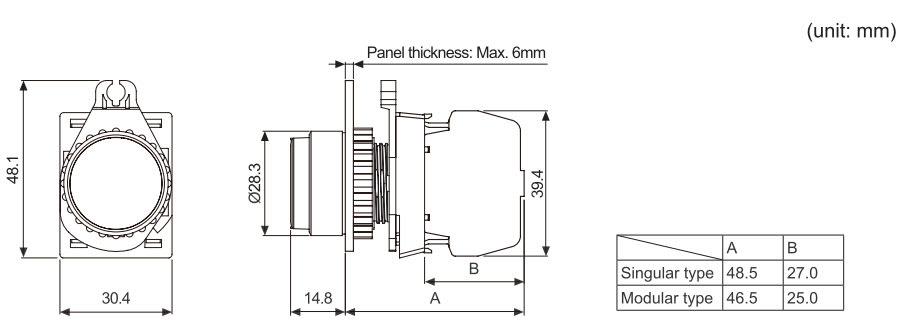 ※ ☐ indicates color: R, B, G, Y, W ※The M in the model name indicates modular type contact block. Models without M are singular contact block ※The control unit, control blocks, LED blocks are sold separately (control unit: bold letters, contact block: regular letters)