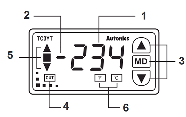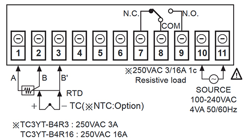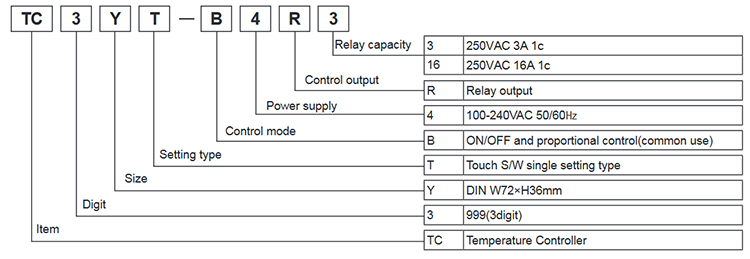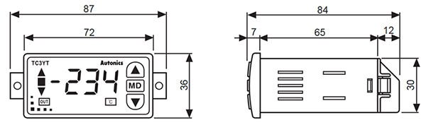 Temperature Controller, W72 X H36 mm, on/off - proportional, 3 digit display, relay output 16A, J, K, RTD input, 100-240 VAC. Input correction, offset correction, manual reset, cooling/heating operation functions.