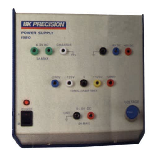 The BK Precision 1520 multi-purpose, space-saving power supply is actually several units in one. It has four outputs, three fixed, and one variable for versatility. Features include a circuit breaker and chassis ground for extra built-in protection.This power supply is ideal for Project Physics or PSSC educational applications.