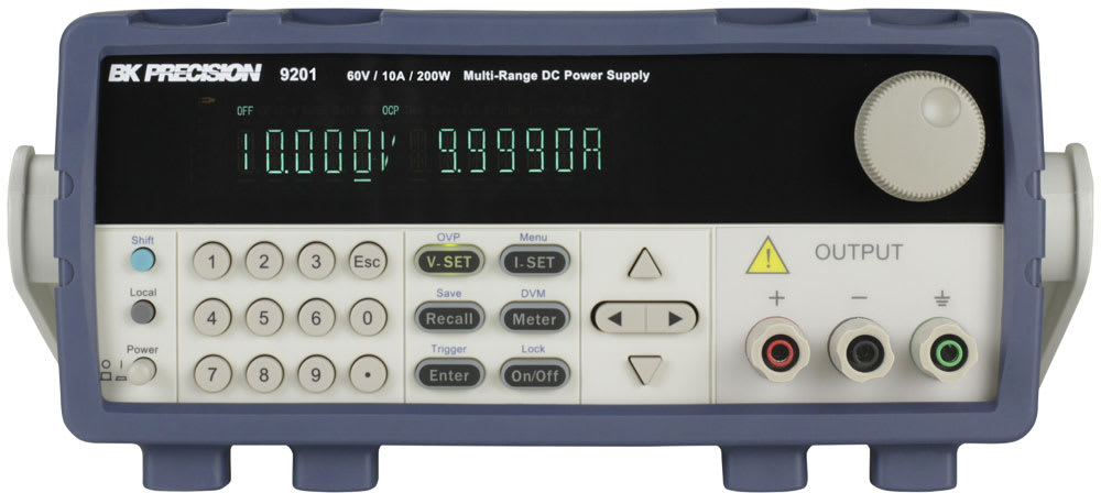 The BK Precision 9201 can replace several supplies on your bench or in your rack. Unlike conventional supplies with fixed output ratings, this multi-range power supply automatically recalculates voltage and current limits for each setting, providing full output power in any Volt/Amp combination within the rated voltage and current limits. For benchtop applications, this power supply provides a numerical keypad for direct data entry along with convenient cursors and analog-style knobs to quickly make incremental voltage or current changes. System integrators benefit from the standard USB (USBTMC-compliant), RS-232, and GPIB interfaces supporting SCPI commands.