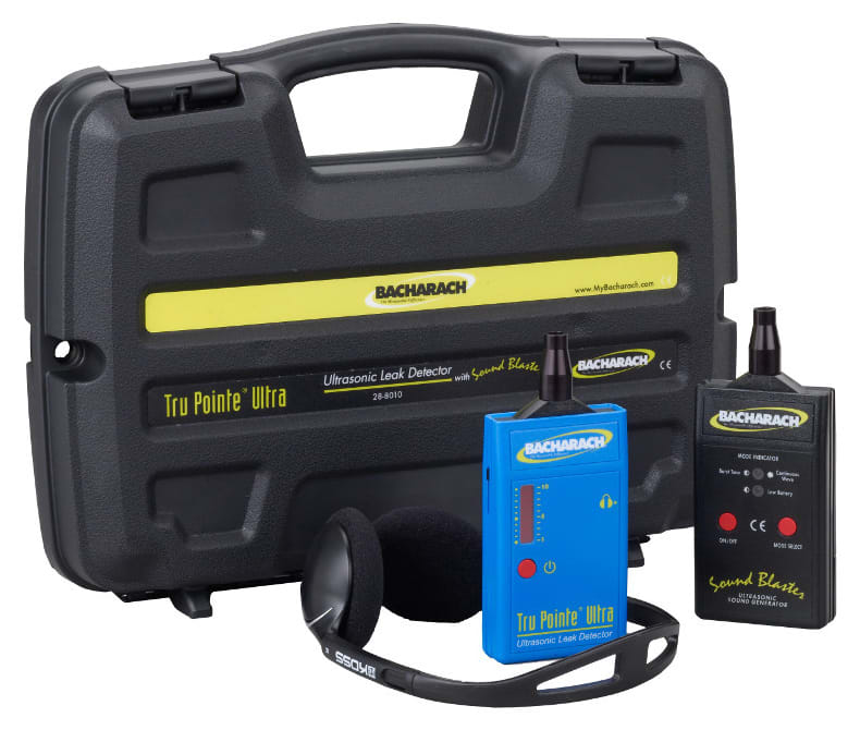 Bacharach's Tru Pointe Ultra is a compact ultrasonic leak detector that uses patented technology to detect leaks in air conditioning and refrigeration systems. The Tru Pointe Ultra is the world's first pocket-size electronic instrument that can simultaneously detect the vacuum and high pressure leaks that occur in HVAC/R systems. The Tru Pointe Ultra guides the user to a leak by quantifying the intensity of the ultrasound and converting it to a sound the user can hear easily through headphones. Tru Pointe Ultra's operational principle is based on the detection of inaudible high frequency sounds produced by the flow of gases and liquids in leaks. The leak flow, passing through very narrow spaces (cracks, holes etc.), generates a rich ultrasonic sound spectrum which is easy to detect with the Tru Pointe Ultra leak detector. Since the Tru Pointe Ultra detects airborne ultrasound and is not a particular to gas chemistry it can detect all types of gases including nitrogen and refrigerants rushing in a system under vacuum. An electronic conversion process called heterodyning translates this ultrasound into true audible sound that helps the user distinguish leaks through headphones. The Tru Pointe Ultra is capable of finding pressure and vacuum leaks in HVAC systems, without being affected by the wind or background refrigerants in confined spaces. It can find a leak as small as 2.5-3oz./yr (84gr/yr). Available with compact, folding headset (Tru Pointe Ultra) or high quality stereo headphones (Tru Pointe Ultra HD), the Tru Pointe Ultra is an indispensable tool that saves time and money for every HVAC/R technician and contractor.