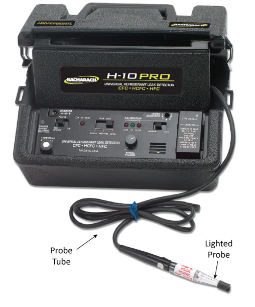 Bacharach’s H-10 PRO is a versatile, high-performance refrigerant leak detector that has been re-engineered on a proven platform with enhanced sensor performance to locate small, medium or large leaks more quickly and efficiently than ever before. The H-10 PRO utilizes a tried-and-true positive ion emission heated diode sensor and selectable sensitivity for the ultimate accuracy in pinpointing the leak source. Enclosed in a durable case with rugged shoulder strap and 4.5 foot (1.37 m) probe, the instrument also features a visible LED leak rate indicator on the probe tip as well as an audible buzzer. The H-10 PRO is the universal standard for checking halogen-based refrigerant leaks in commercial and residential applications.