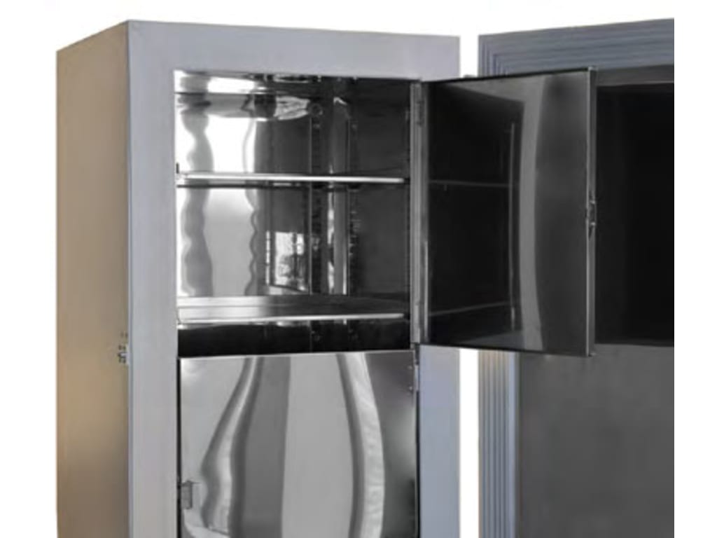 The inner chamber, shelves, and inner doors are made entirely from stainless steel.