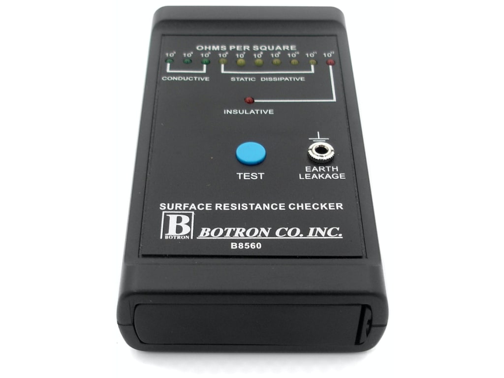 Botron’s series of surface resistivity testers are used for measuring, but not limited to, work surfaces and flooring. The testers are easy to read LEDs illuminate according to test results. These quick-test surface resistivity testers are light and portable and are ideal for on-the-spot testing of RTT and RTG (when using optional external probes).