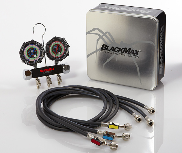 BlackMax Black & Chrome series 2 valve anodized aluminum block body with 1/4" SAE 45° fittings, Triple Seal piston valves, easy-to-read 3 1/8" (80mm) Class 1.0 accuracy gauges, protective gauge boots, extra access port in center with Schrader valve. MADE IN USA