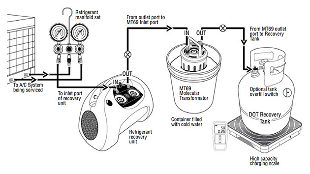The MT69 is the only commercialized recovery sub-cooler manufactured for the professional A/C & R technician. It transforms molecules of hot refrigerant gas into molecules of refrigerant liquid and also transforms molecules of cold refrigerant liquid into a warm refrigerant gas. Use the MT69 in-line with the discharge line of any recovery machine to dramatically increase the speed of recovery.