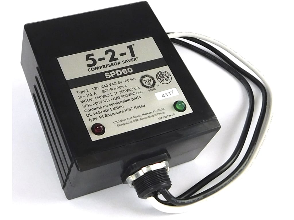The 5-2-1 Compressor Saver® introduces the SPD150 Surge Protection devices that incorporate the latest in protection technology and ease of installation. These devices are designed to protect your equipment by suppressing the harmful energy produced by lightning strikes and other power line transients commonly found in HVAC installations. The voltage surges or spikes can be very damaging to HVAC equipment, shortening the life of the compressor and reducing its efficiency.