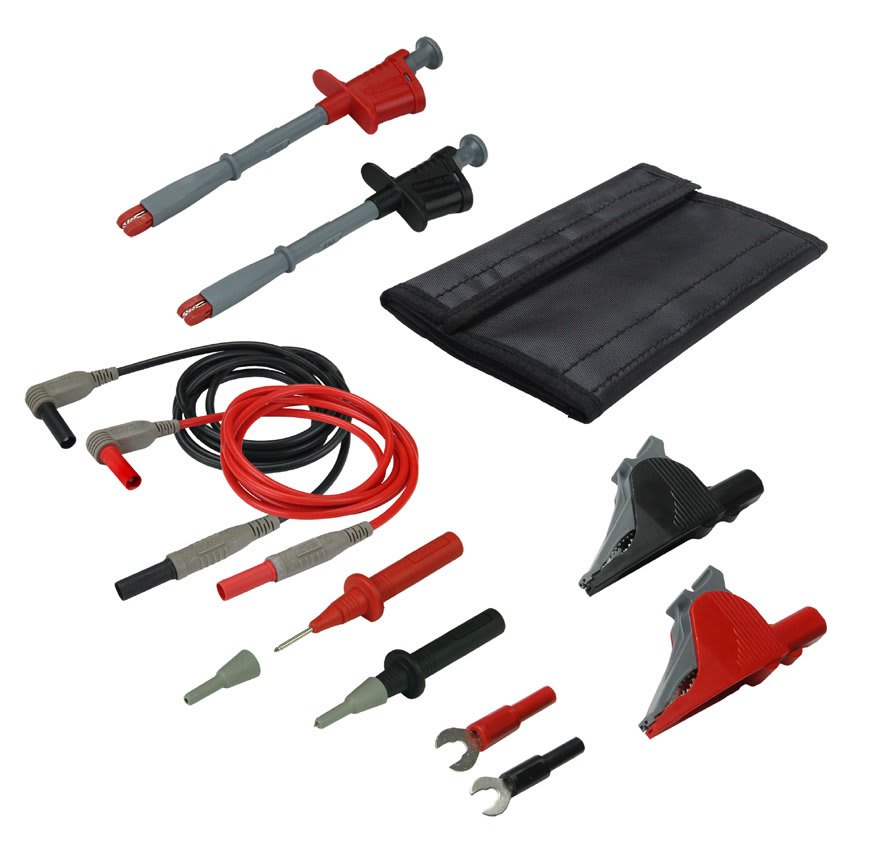 Silicone jacketed lead wire Electrical DMM Kit, which includes Probe Bodies, Banana Test Leads, Adapters, Rigid Alligator Clips, Insulated Alligator Clips and Tri-Fold Nylon Pouch.