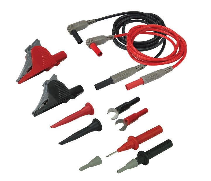General Purpose Handheld DMM Kit which includes Probe Bodies, Banana Test Leads, Adapters, Sprung Hooks and Insulated Alligator Clips.