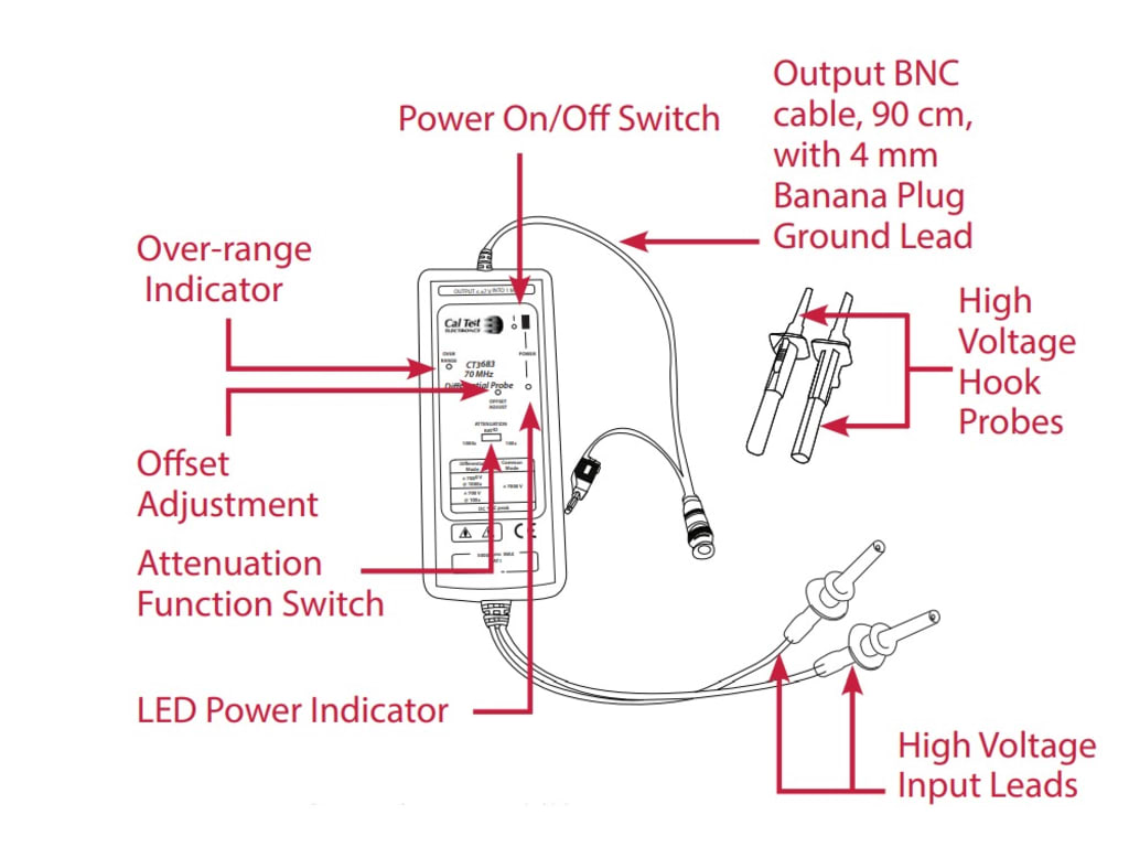 Model CT3683 features 100x/1000x attenuation settings, 70 MHz bandwidth, ±7,000 V maximum differential, and unique high voltage input leads and hook probes.