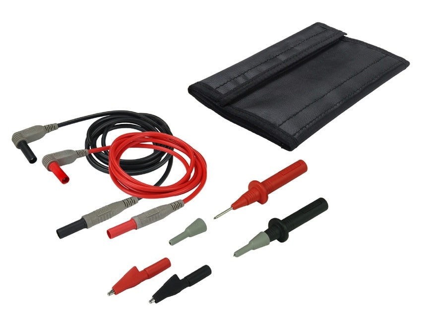 Basic Electrical DMM Kit which includes Probe Bodies, Banana Test Leads, Insulated standard Alligator Clips and Tri-Fold Nylon Pouch.