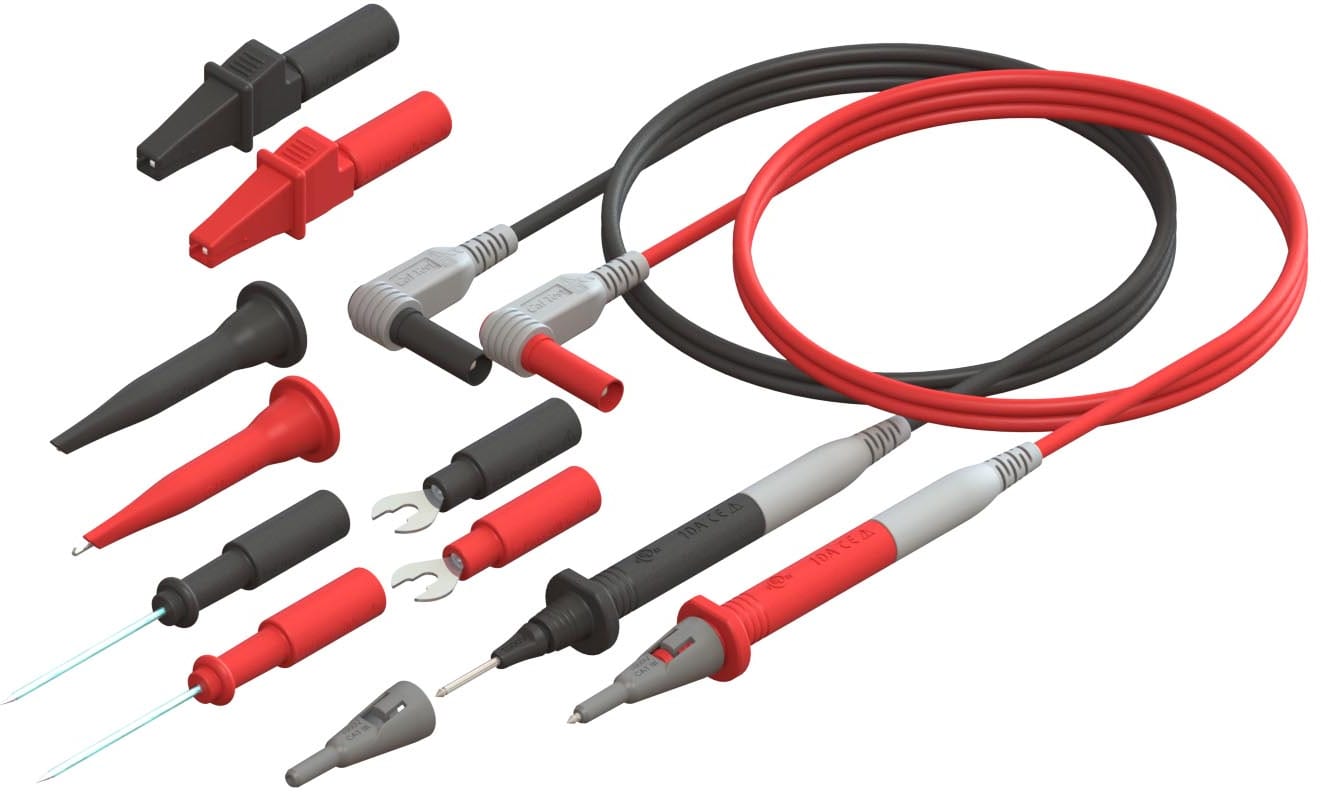 Pair of DMM probe with fixed right angle sheathed banana plug test leads, with 2 mm (.080") diameter x 19 mm (0.75") probe tips for all test applications. With locking cap installed, the probe meets 600 V CAT IV applications. Remove the locking cap for access to the standard 2mm tip and to attach tip accessories. Includes pair of extended tips, alligator clips, spade lugs and sprung hooks all featuring "snap-locks" to probes.
