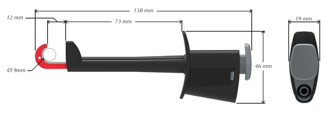 Cal Test’s Safety Hook Clip can grip terminals up to 9 mm in diameter. The fully insulated spring loaded clip is IEC 61010-031 rated to 1000 V in a CAT IV environment to 20 A. The 4 mm safety banana jack makes for easy connection to standard sheath (shrouded) banana plug leads. Available individually in 2 colors (model CT4378-#) or a convenient black and red pair (model CT4379). Applications include electrical, automotive, industrial and high power electronics.