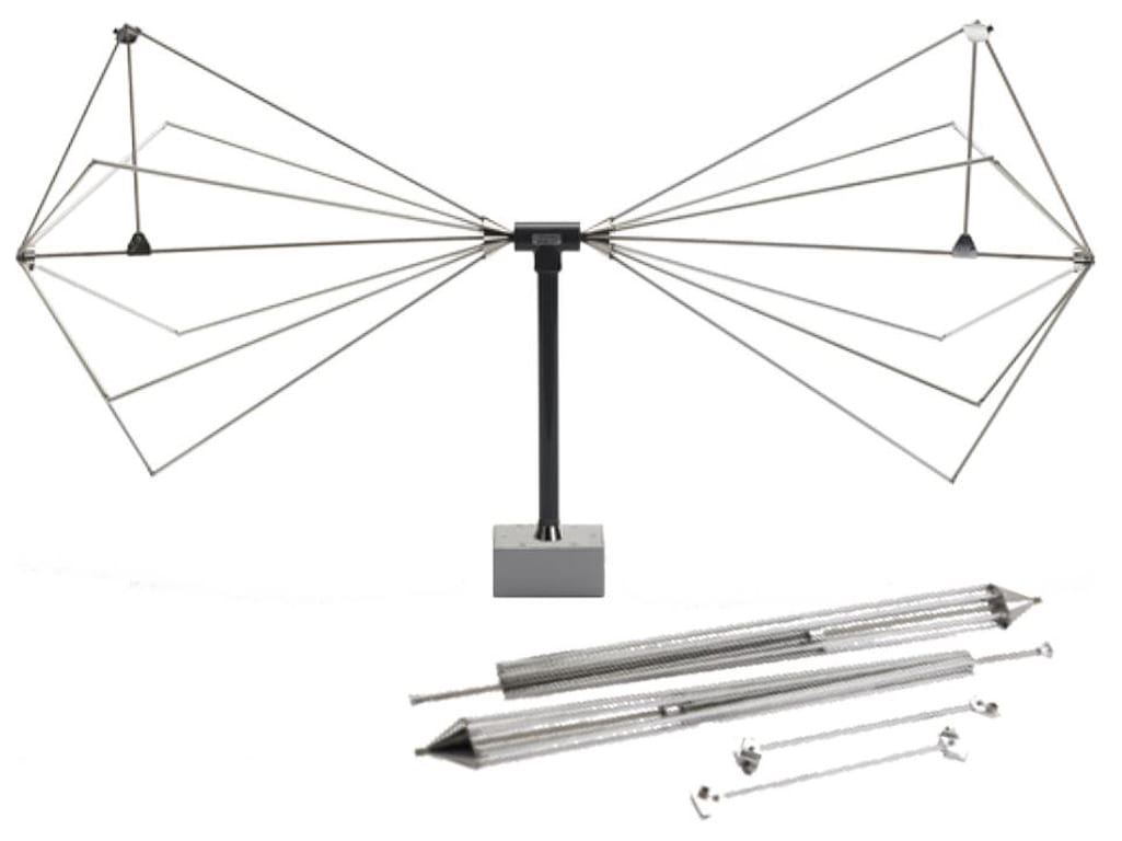 The ABF-900A is a broadband, linearly polarized Biconical Dipole Antenna with collapsible elements, operating over the frequency range of 25 MHz to 300 MHz. Each full-size biconical element (54 cm cage diameter) collapses to a maximum diameter of 5 cm for easy transport/storage.