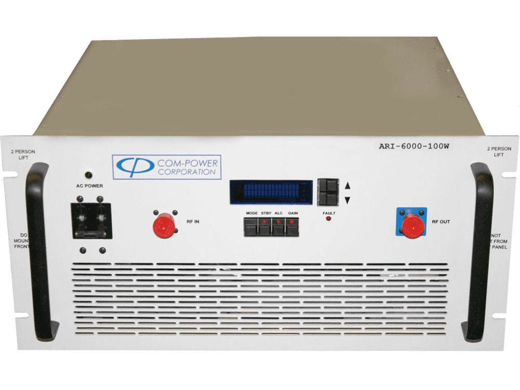 The ARI-6000-100W is part of Com-Power's series of broadband RF amplifiers; diverse in application, yet specifically geared for use in EMC immunity testing applications. The ARI-6000-100W model was engineered to provide high gain, with excellent efficiency and reliability, at an unbeatable price. It has 53 dB gain minimum, 100 Watt typical power output.