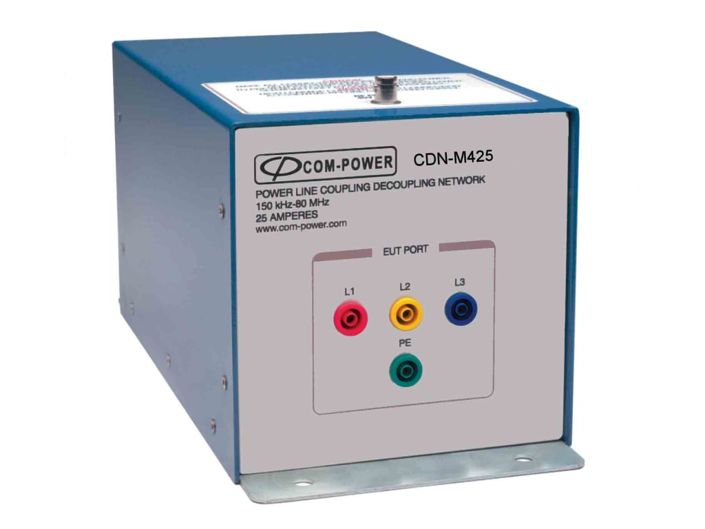 The M series powerline Coupling / Decoupling Networks (CDN) are for testing from 150 kHz - 80 MHz according to the EN 61000-4-6 standard for immunity to conducted disturbance induced by radio frequency fields. The standard M series CDNs are available with 25 amperes current rating. The coupling network delivers injected common mode current disturbance signals through the power line conductors to the equipment under test (EUT). The decoupling networks are used to ensure that the disturbing signals injected on the powerline of the EUT by the coupling networks do not interfere with any of the auxiliary equipment connected to the EUT. Each CDN contains integrated direct capacitive coupling along with a high impedance choke for inductive decoupling. All CDNs are individually calibrated to meet the impedance requirement of EN 61000-4-6. However, test level calibration must be performed on site to determine the minimum required test signal needed to achieve the required voltage levels specified by EN 61000-4-6. The appropriate calibration accessories for conducting the test is available from Com-Power.