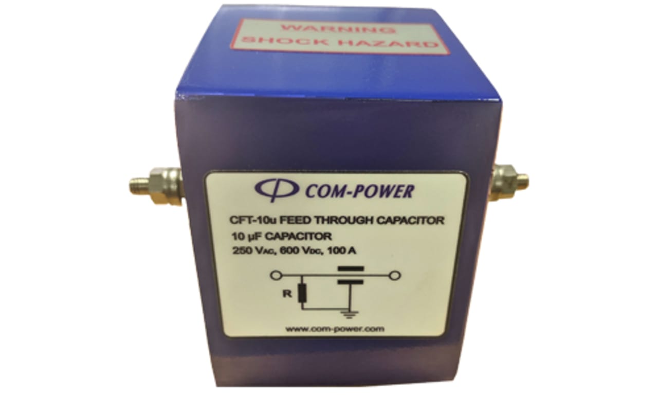 The ruggedly constructed feed-thru capacitors are highly reliable units for general use in screen rooms and other environments. It has four threaded inserts for easy installation on metal enclosure. Its M6 threaded feed-thru stud will allow power current of 100 Amps without heating or voltage loss. These have low dissipation factors, high temperature ratings, high insulation resistance, doubly rated dielectric strength, and long life. A bleeder resistor is included within the capacitors, to discharge the capacitors when applied voltage is removed.